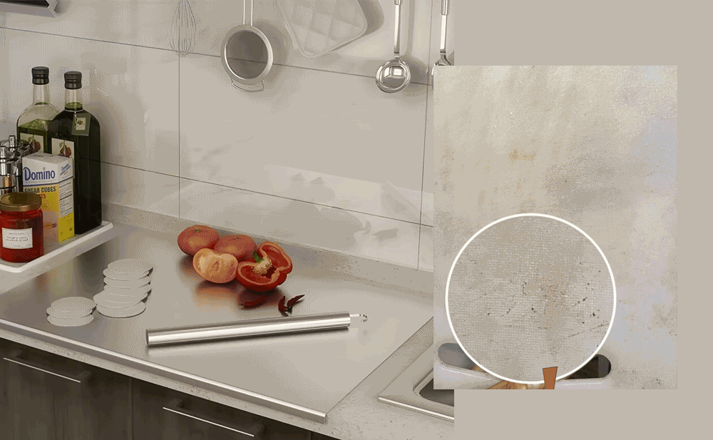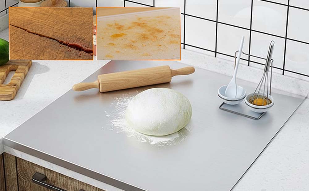 Unlike wood (which drinks up bacteria) or plastic (which hides bacteria in scratches), the Stainless Steel Board surface is impenetrable. Bacteria sit exposed on the surface, where a simple rinse washes them completely away.